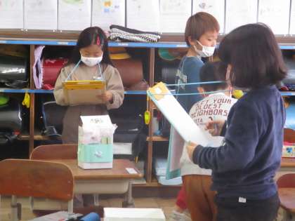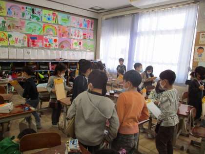 図工「かざってなにいれよう」の学習では,先週までに作った自分の作品のふり返りと,お友達の作品の鑑賞をしました。
