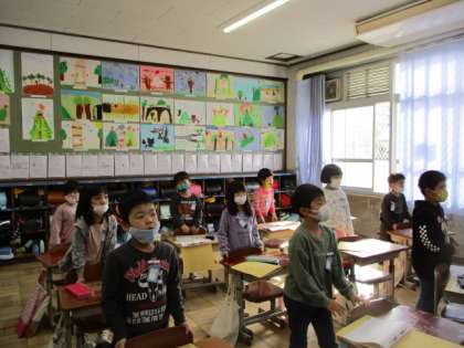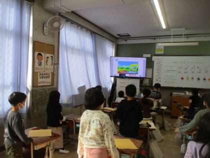 1年生も英語活動が始まりました。今日は,3回目。挨拶や色,数字などを学習しました。英語の歌も歌っています。とてもかわいい歌声です。次の英語活動も楽しみですね。