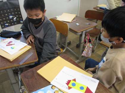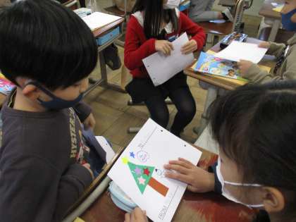 外国語の学習では,集めた模様を使ってオリジナルカードを作りました。「おかあさんにあげたいな。」「お正月に合うおじいちゃんに渡そう!」などわくわくしながら作っていました。友達と紹介するときは集めた形や色,数などを伝えることができていました。