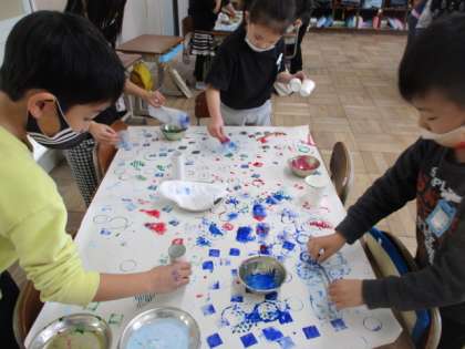 今日は,図画工作科で「ぺったんコロコロ」の学習をしました。絵の具をつけて,形をうつしました。友達と一緒に大きな紙にぺったんぺったん。形を重ねたり,どんどん押したり・・・。仲良く楽しく活動できました。
