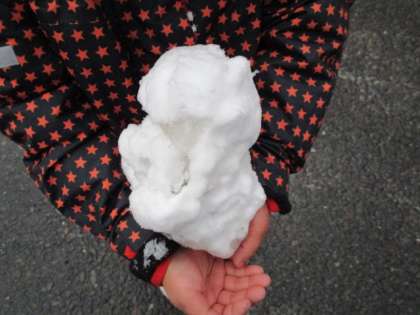 笑顔いっぱいで,それぞれが作った雪玉を見せてくれました。中には,素手で手を真っ赤にしながら雪を抱えている子どもも…。それでも,