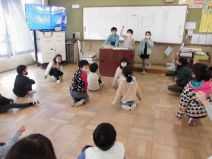 外は雪で,残念ながら運動場で遊べません。教室でみんな遊びをしました。けがをしないように,気をつけながら仲良く遊びました。
