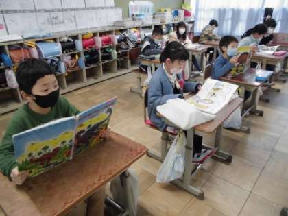とても静かな読書の時間です。子どもたちは,読書が大好きです。読書ノートを活用して記録もしています。まずは50さつ。そして,100さつをめざしてほしいです。