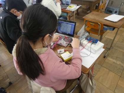 理科の学習ではマイクロビットという小型コンピューターボードを使った学習をしており,「あかりをつける」ためのプログラミングをしています。