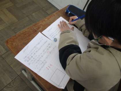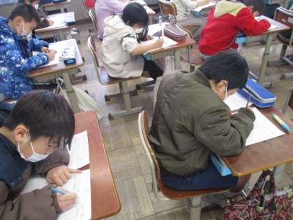 国語の学習で,今までに作った作品の中から,お気に入りの作品を紹介する文章を書いています。下書きを友だちと推敲し合い,いよいよ本番です。みんなとても集中して書くことができました。