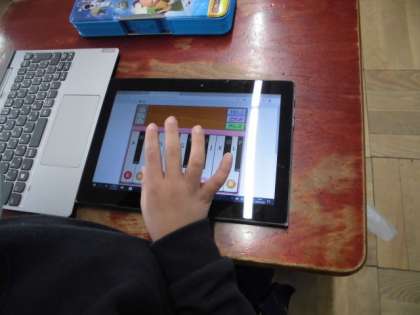 「小ぎつね」の曲を,指使いに気を付けながら,タブレットで練習中です。自分の指や手の大きさに合わせて,画面を大きくしています。リズムにのって演奏することができるようになってきました。