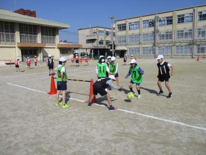 体育ではサッカーをしています。チームで作戦を考え,少しずつチームワークがよくなってきたようです。