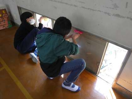 砂ぼこりだらけの体育館の床を雑巾がけしたり,ほうきをつかって砂をはいたりり,窓を新聞紙でみがいたりとそれぞれの持ち場で一生懸命取り組む姿が素敵でした。