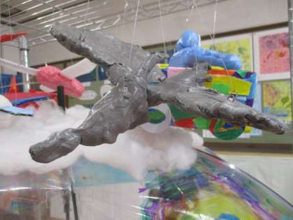 紙粘土に絵の具を塗り込んで,プテラノドンを作りました。