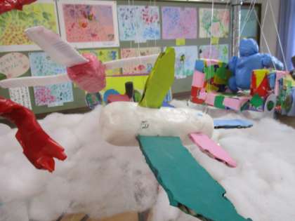 紙粘土にダンボールの翼を付けて飛行機を作りました。