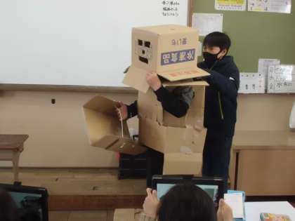 係活動でモノづくりの係が段ボールで着ぐるみを作って披露してくれました。