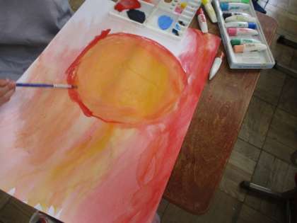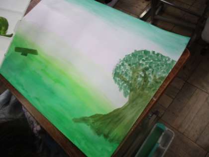 図画工作の時間に,一つの色からイメージしたものを絵の具を使って表現しました。同じ色でも白色や水を上手に使うことで,一人ひとり違った色を表すことができました。これからの図工の作品にも,この力を生かしてほしいです。