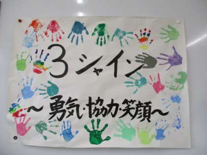 みんなで手作りした3シャイン〜勇気・協力・笑顔〜を学年目標に掲げ,頑張っています。