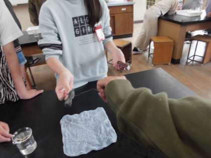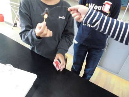 理科の実験に,グループで協力して取り組んでいます。スチールウールを燃やすにはどうしたらいいか考えて実験をしました。新しく出会う事象に興味津々で,意欲的に理科学習に臨んでいます。