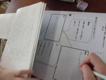 「帰り道」の登場人物である,律と周也の人柄について考えました。人柄を表すことばを確かめたり,根拠となる文章を探したりしました。