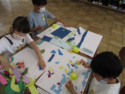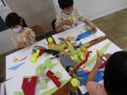 紙をやぶいて何に見えるか考えました。「ふねに見えるな。」「くだものに見えてきたよ。」など,やぶいた形から想像を広げて作品を作っていました。