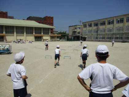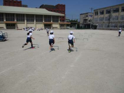 慣れたころに高いハードルを使って,足の使い方や伸ばし方を学び,ハードル走に慣れ親しみました。
