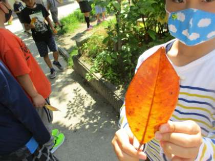図画工作「み近なしぜんの形・色」を学習しました。校庭で葉や小石,木の枝を探しました。子どもたちは,とても楽しそうに探していました。お気に入りの葉や,とっておきの石を見つけたら教室へ。見てさわってたしかめて,絵をかきました。