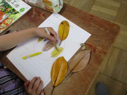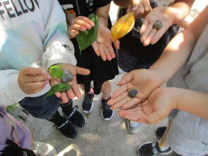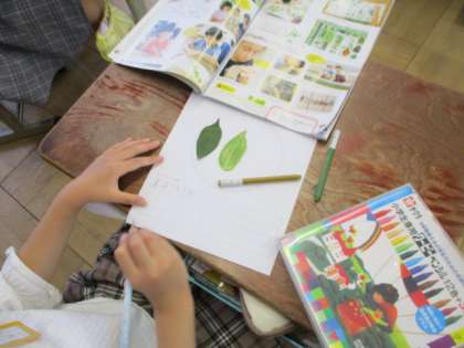 お気に入りの葉や石を見つけて教室へ戻って,絵にかきました。感じたことも書きました。その後,葉や石をあった場所にそっと返しました。