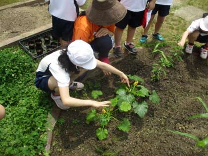 野菜の観察をしました。2週間前に植えたズッキーニに小さな実がついていました。花はかぼちゃの花に似ていました。どんどん大きくなっておいしい実ができるよう願いながら水やりをしています。