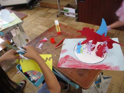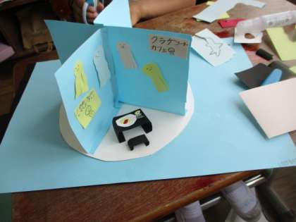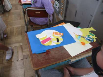 図画工作で「くるくるランド」をしています。わりピンを使って紙を回す仕組みから,思いついたものを表します。楽しい作品ができそうです。