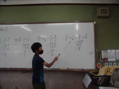 分数×分数で,計算の結果だけでなく,なぜそのような計算結果になるのかを説明することを大切にしています。何度も説明したり,説明を聞いたりして確かに計算できるようにしていきます。