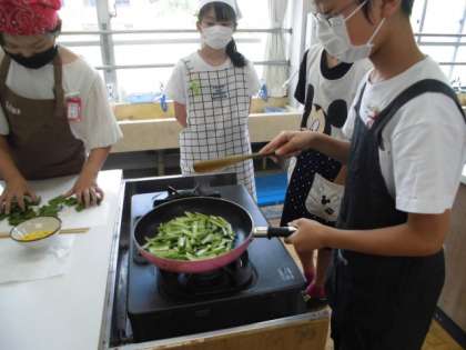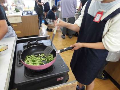 フライパンに油をひいて,いよいよ炒めます。フライパンを使うのも慣れた手つきです。流石6年生。