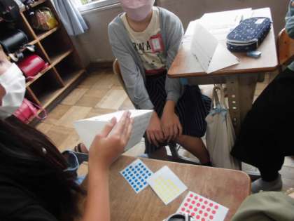 筆者の主張に対する自分の考え,その理由,生かしていきたいことなどを書きまとめました。ワークシートを三角柱にしま3つの段落を意識して交流できるようにしました。