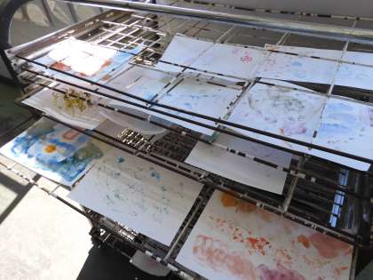 廊下に置かれた乾燥だなには,たくさんの作品が並んでいます。