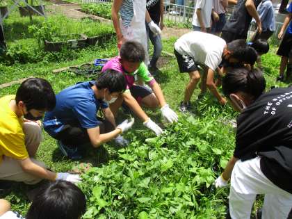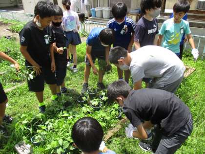 理科の学習では育てているアサガオの周りに雑草が生え始めたので,