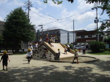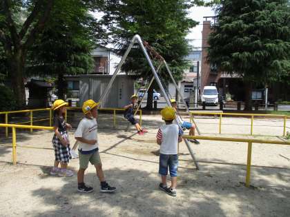 夏を見つけをしたあとは公園で遊びました。子どもたちは,汗だくになりながら楽しそうに遊んでいました。汗拭きタオルと水筒のご用意,ありがとうございました。