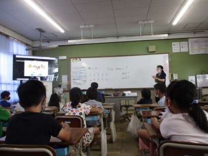 「How many〜 ?」と質問し,果物の絵を見て数を答える