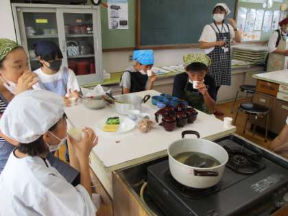 先週、日本料理アカデミーの会員である料理人の方に来校いただきました。京都ならではの「日本料理に学ぶ食育カリキュラム」を踏まえ,今回はアカデミーの先生や「だしの先生」と一緒に出汁(だし)を使った料理を通して、日本料理の奥深さや五感を通して味わうことについて、6年生が体験的に学びました。