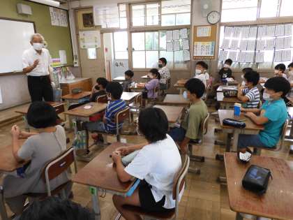 回復授業2日目は、本校の元校長先生が、伝達式に来られていた日でもありましたので、子どもたちの様子を一目見ようと、教室まで足を運んでくださいました。