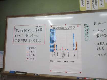 社会の宿題「買い物調べ」のご協力ありがとうございました。買った場所と買った物を聞いてシールを貼っていくと・・・スーパーマーケットで,食料品をたくさん買っていることがわかりました。どのクラスも,とても楽しい授業になりました。