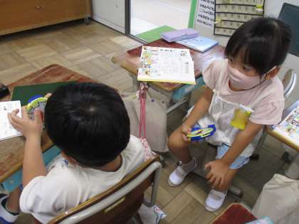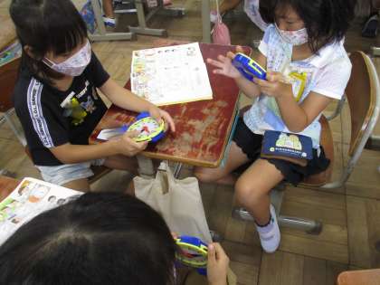 今日は小さい時計の模型を使って時刻を合わせる練習をしました。隣の友達と問題を出し合いながら楽しく練習することができました。