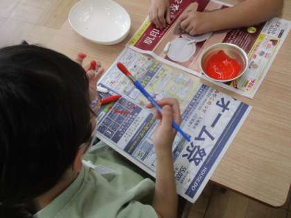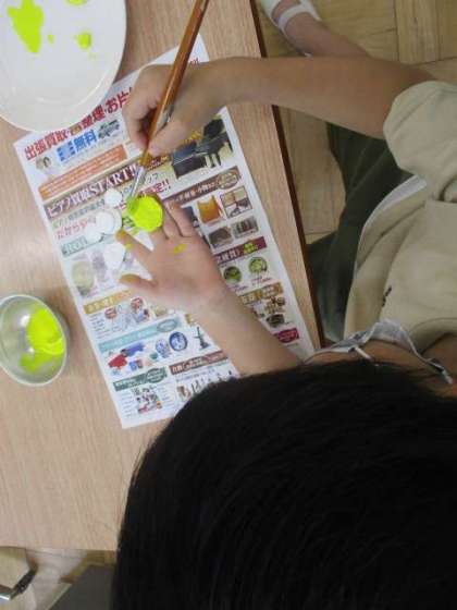 はしの練習をするために粘土で作った道具に色を塗りました。手先を器用に使って、小さな粘土に筆で色を塗りました。職人のように白色が見えなくなるまで塗っている子どももいました。