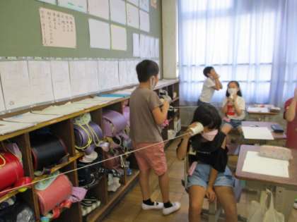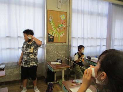 大喜び。「聞こえた!」「糸をピーンと張らなあかん。」実際にやってみると、気づきがありました。とても楽しそうでした。