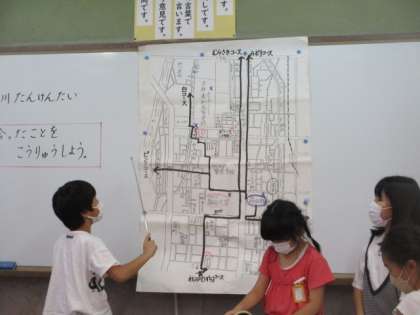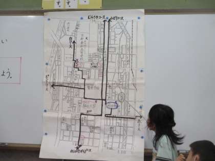 下校コースごとに分かれて,危ないところはないか話し合いをしていました。今日は,中間ミニ発表をしました。また続きをやる予定です。