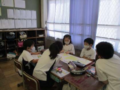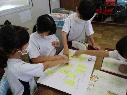 「山小屋で三日間すごすなら」の2時間目。今日は、グループで出し合った意見を絞っていきました。理由を言い合ったり、手を挙げたりして、上手に決めることができました。