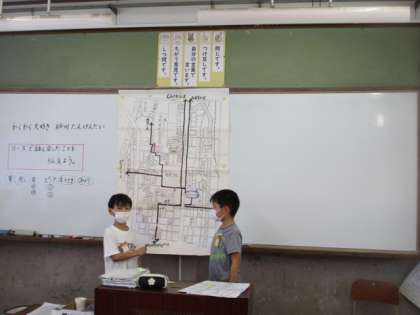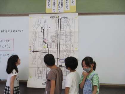 「わくわく大好き砂川たんけんたい」の学習で、コース別に危険なところはないか話し合っていました。今日は、ミニ中間発表の後半。他のコースの発表を、しっかり聞くことができました。