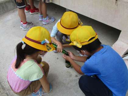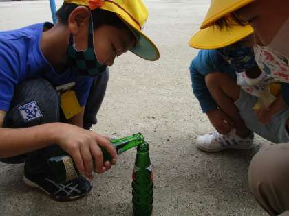 2つのビンを比べて、どっちの方がたくさん量が入るかを調べました。はじめは両方のビンに水を入れて「どうやってこれを比べるんやろ?」と不思議そうにしていましたが、「1つを空っぽにして入れてみたらいいんちゃう!」と気付いたようでそれぞれの班が調べることができていました。