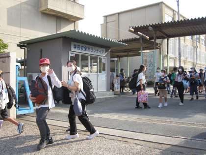 たくさんの保護者、在校生に見送られ出発。