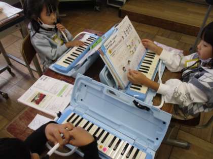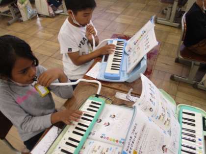 旋律を作って同じグループの友達とまねっこあそびをしました。「この組み合わせは合うなぁ。」という声が聞こえるなど、子どもたちなりに旋律づくりを楽しんでいました。