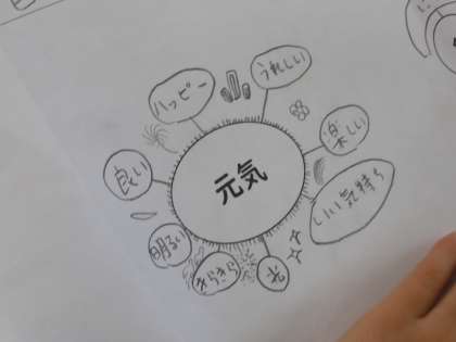 今日の学習では、元気な感じに合う「形」や「色」について、ウェビングマップをかきながらイメージを広げ、話し合いました。その後、イメージしたことをもとに、自分がつくりたい「元気のおまもり」のアイディアスケッチをしました。