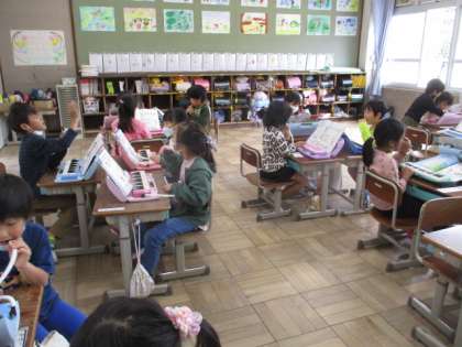 今日の音楽の時間は,グループの友達と向かい合って座り,
