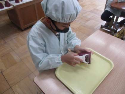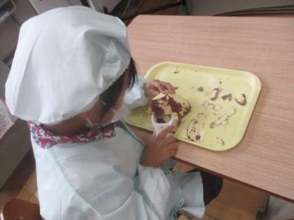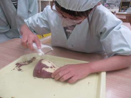 初めはなかなかむけませんでしたが、力の入れ方を伝えると、コツをつかみ上手にピーラーを使うことができていました。