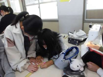トートバック作りで、協力しながら作業を進めています。困っていたら、教え合ったり、補助し合ったりしています。