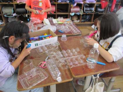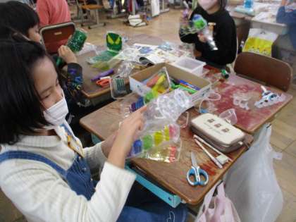 「クリスタルアニマル」の学習をしました。ペットボトルや卵パックの準備、ありがとうございました。世界にったった一つの生き物を作り、カラーペンで色をつけました。グループの友だちと楽しそうに作っていました。