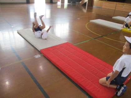 マット運動で「こんな技ができるようになったよ!」「次は難しい技に挑戦したいな!」と前向きな言葉がたくさん聞こえてきました。